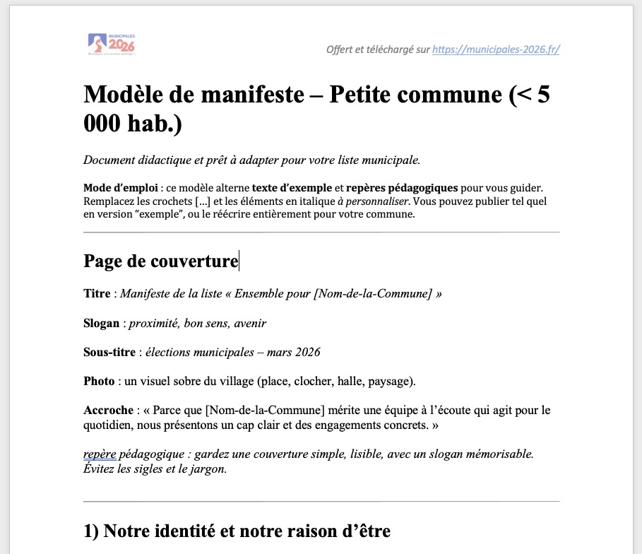 Modèles de manifesteUn modèle clair et didactique pour les villages et petites communes, centré sur la proximité, les services essentiels et la participation des habitants. Il propose un diagnostic simple, 12 engagements concrets et une feuille de route réaliste, avec un résumé en 1 page.